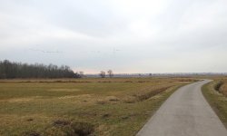 Ik hobbel er rustig overheen en kom even later bij de beek. Tot mijn verrassing zit er een hekje voor het kleine paadje terug naar de weg. Kan ik daar wel overheen met de fiets? Ik kan wel een stukje lopen toch? Ik maak het hekje open en wandel met de fiets aan de hand over het smalle paadje. Ik heb weinig zin om terug te rijden over het hobbelpad eigenlijk en ik weet van dit pad waar het uitkomt. Rechts van me ligt het Veluwemeer met veel vogels. Ik zie dat het nog deels bevroren is maar dat zal nu wel snel verdwijnen denk ik. Het geluid van de ganzen is oorverdovend. Een stukje terug vlogen er ook ganzen over en dat was echt een enorm kabaal. Op een foto kan je zoiets helemaal niet vatten natuurlijk maar het blijft mooi. Het paadje is korter dan ik me herinner en ik kan al vrij snel weer opstappen. Ik fiets voorzichtig over een pad dat naar links en rechts nogal afloopt en waar de klinkers wijd uit elkaar liggen. Niet geschikt voor een racefiets lijkt me.