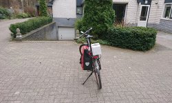 Na 31 minuten sta ik alweer op het station Amersfoort Schothorst. Ik fiets naar de kliniek, zet de fiets vast en ga naar mijn afspraak. Na een half uurtje ben ik weer klaar en kan ik vertrekken. Het is nog steeds droog dus het eerste stuk fiets ik lekker met droog weer naar huis. Voor de eerste keer heb ik rechts (de schakelhand) mijn brace om onder mijn fiets handschoen. Ik wil wel eens kijken of ik daarmee kan rijden en of dat scheelt. Ik kan altijd onderweg stoppen en het weer afdoen.