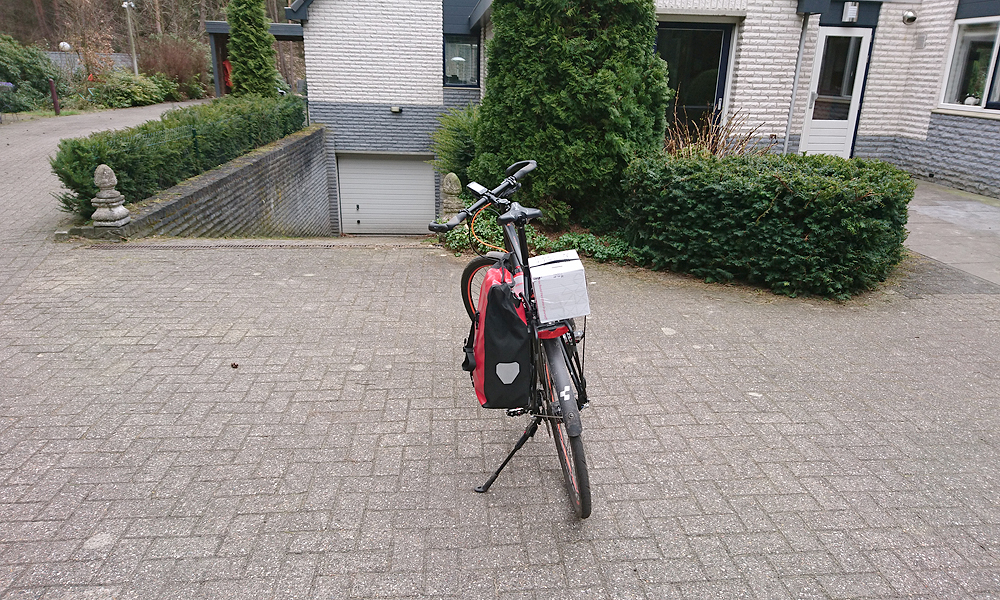 Als ik de Brandsweg oprijd wil ik even wat rustiger uitrijden. Dan word ik ingehaald door een wagen van DHL. Die is vast naar mij op weg met de wildlife camera in de wagen. Ik zet dus nog even aan zodat ik haar niet ga missen en scheur door naar ons huis helemaal aan het einde van de weg. Dat is nog een kilometer. Ze staat net met het doosje in de hand bij het hek te wachten. ‘als ik dat geweten had, had ik niet de hele weg doorgereden‘ zegt ze en ze moet lachen. Ik neem het doosje aan, prop het onder de snelbinder en rijd door het hek naar binnen. Beetje slecht einde zo met dat harde fietsen maar zo ging het ook. Totaal 45 km gefietst vanmiddag dus een lekker rondje.