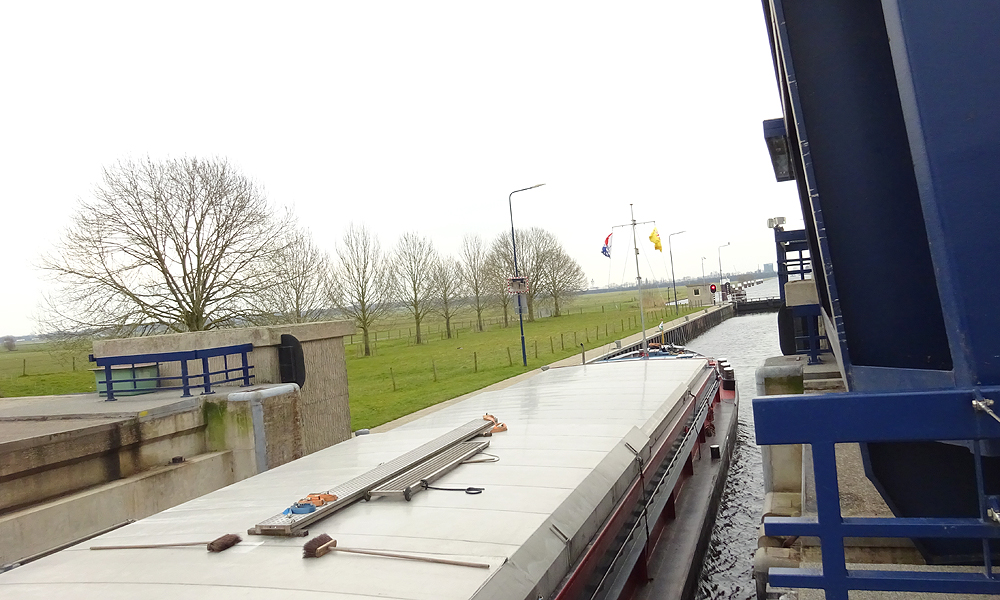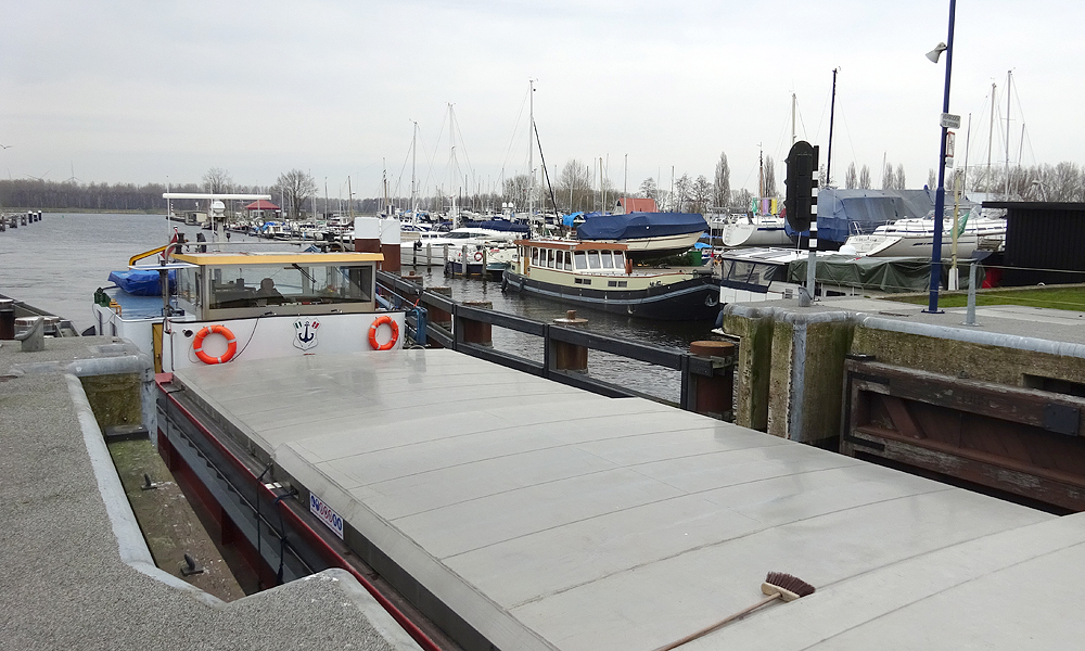 Ik ga er toch niet helemaal heen omdat het gesloten is en rijd weer terug over de dijk. Dat valt niet mee want de wind staat nu toch een beetje tegen en mijn tempo zakt gestaag. Ik zag iemand ook deze kant opfietsen toen ik nog richting het stoomgemaal reed met windje mee en toen vond ik al dat die man snel fietste. Zal wel een elektrische fiets zijn. Ik ga weer de route volgen maar kom even later tot stilstand omdat de brug open staat voor een enorm schip. De snelle fietser staat er ook. Hij rijdt op een Stromer, een elektrische fiets inderdaad. De man vertelt dat hij altijd op een racefiets zat maar nu op deze fietste. Hij zegt dat hij er wel 30 km/uur mee kan rijden. Een snellere kon ook maar dan had hij een helmplicht. Ik begrijp helemaal niet dat hij geen helm draagt en zeg er iets van. Misschien heeft hij in die schedel niets om te berschermen, dat lijkt er in ieder geval wel op. Moet iedereen zelf weten natuurlijk maar ik vind het stom.