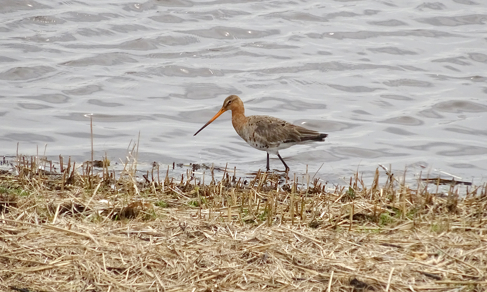 Als de brug weer dicht gaat, kunnen we weer verder. Gelukkig slaat de man op de snelle fiets linksaf en ik volg de dijk rechtdoor. De vorige keer ben ik vanaf de dijk naar beneden gereden en richting Putten gefietst en daarna door het bos. Nu rijd ik gewoon door. Hier mogen helemaal geen auto’s meer en het stukje zo vlak langs het water is echt prachtig. Overal vogels en ik geniet volop ook al gaat het niet zo snel vanwege de wind. Als ik mijn eerste Grutto zie, stop ik voor een kiekje.