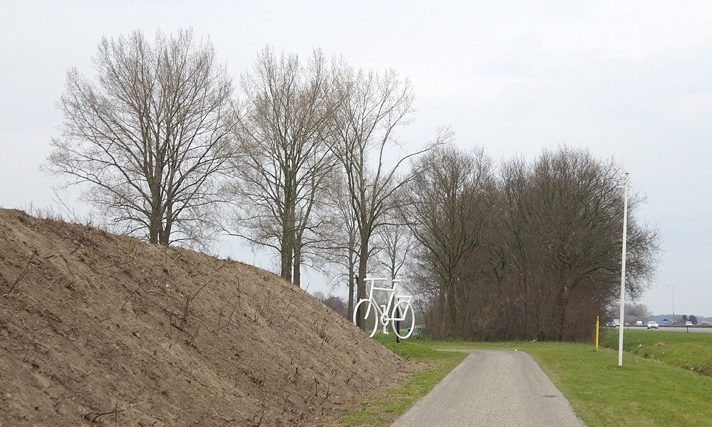 De bomen langs het fietspad lopen ook langzaam uit inmiddels en dat maakt ook weer uit. Overigens is het nog steeds droog dus ik bof enorm. Ik maak een kiekje van de grote witte fiets die ook vanaf de snelweg zichtbaar is.