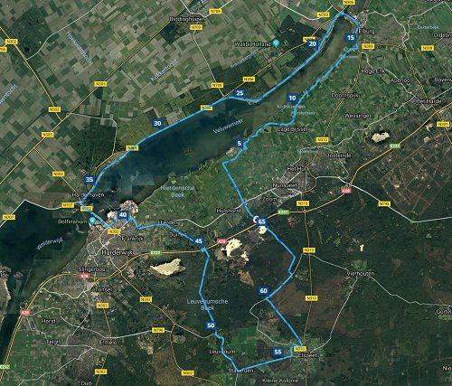 A. wilde aanvankelijk om 10 uur komen maar dat leek me erg laat voor deze warme dagen (27 graden voorspeld). Uiteindelijk komt ze toch iets eerder en rijden we dan om 9.30 weg van huis. Ik heb een route gemaakt langs het Veluwemeer en eventueel kunnen we die inkorten of alternatief rijden met een lus door het bos als het erg warm is. Totaal zullen we ongeveer 65 km gaan rijden als alles goed gaat. Ik reed het rondje al eerder dus ken een beetje de weg.