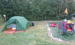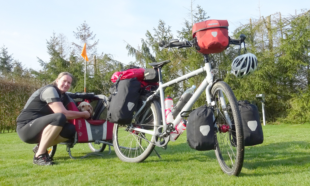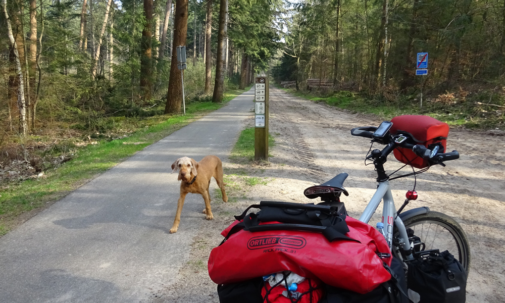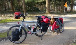 Het inpakken gaat daarna redelijk vlot. De tent is nat van de dauw en zit in 2 zakken. Dat scheelt een heleboel ruimte altijd. De grootste dingen zijn eigenlijk van woef. Haar bedje, het dons dekentje, haar jasje en voer. Het jasje zit altijd in de doggyride zodat ik er meteen bij kan als het moet. Het bedje kan redelijk klein worden opgevouwen maar om onduidelijke reden ben ik vergeten een compressie zakje om haar dons deken te doen dus dat is best een groot ding zo in de tassen. Maar het past natuurlijk allemaal prima. Ik heb weliswaar een reserve setje fiets kleding bij me maar ik besluit gewoon hetzelfde aan te trekken als gisteren. De wasmachine is geduldig en het stinkt niet. Het is mijn enige shirt van dit materiaal dus vooruit maar. Als alles in de tassen zit, rijd ik weer naar het douchegebouw om alle bidons nog een keer goed bij te vullen. Ik ben ook vandaag weer goed ingesmeerd maar dat werk ik ook nog even bij in de toiletruimte. Het is klokslag 9.30 uur als we wegrijden en dat vind ik niet slecht. Meteen als we aan de overkant in het bos zijn, laat ik woef weer uit de kar voor haar wandelingetje.