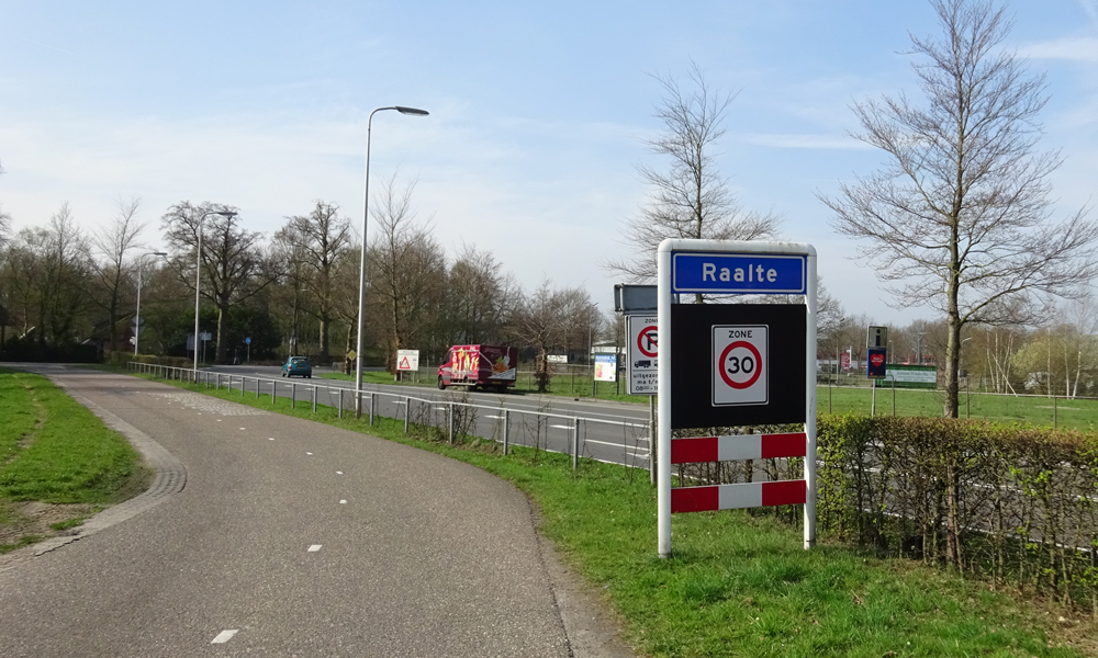 Na Marienheem voert de route me naar en door Raalte. Dat is nog even lastig, want woef moet er straks even uit voor haar hapje en eigenlijk zie ik zo snel niks leuks om haar er uit te laten. Ze begint ook wat te morren achter me maar ik trap nog even door. Ik wilde na de laatste stap ook wel even een stukje rijden want met al dat stoppen en wandelen komen we er natuurlijk niet en vandaag is best een aardig ritje met zo’n 85 km te gaan. Ik weet het niet eens zeker hoe ver het zal zijn vanwege de andere start en de andere route die ik nam. Ik hou dus rekening met 90 km en stem daar een beetje op af wat ik doe en hoe lang ik tussendoor ga rijden. Maar uiteindelijk vind ik toch een paadje in Raalte waar ik even kan stoppen voor een hapje voor woef en een plasje. Het blijkt een parkeerplaats te zijn van een OBS die zelfs eigen sportvelden heeft. Mooie school, hadden wij vroeger niet.