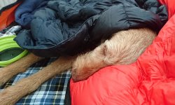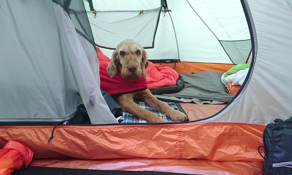 Vannacht heb ik redelijk goed geslapen. Er is geen druppel regen gevallen en onweer heb ik ook niet gehoord. Jammer genoeg ook verder geen uilen of andere dieren gehoord. Ik ben vroeg wakker en geef woefje meteen te eten. Ik moet er volgende keer wel om denken dat ik mijn matrasje beter opmaak en daar even de tijd voor neem. Nu zat ik af en toe verstrikt in mijn laken en dat is niet nodig. Ook mijn kussen was geen succes met alleen mijn jas en trui in het kussensloop. Dat is net een beetje te weinig eigenlijk. Verder was het prima alleen nam woef weer meer dan de halve tent in beslag natuurlijk……
