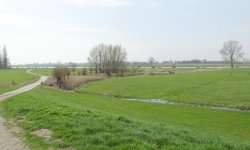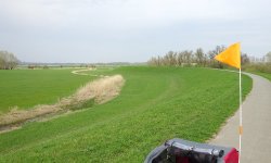 Inmiddels is het 12.30 geworden en heb ik 38 km gefietst. Niet zo slecht met een vertrek om 9.30 vanaf de camping en met al het wandelen en stilstaan dus. Het voorliggende stuk viel helemaal niet mee, want ik had een extra lus ingetekend waar ik eerst vol de wind tegen had. Met de ZO wind zal ik straks een heel stuk windje mee hebben dus ik heb gewoon rustig door getrapt. Maar het is dan wel even een beetje afzien. En dat terwijl er nauwelijks wind staat. Maar de vol bepakte fiets met de kar is nu eenmaal een zwaar ding om in beweging te houden. Onderweg op dat stukje bleek ook nog een afslag niet te bestaan (bleek een pad naar een boerderij) en moest ik dus omfietsen. Ik hoopte maar dat de lus die ik gemaakt had en me langs de IJssel zou voeren wel de moeite waard zou zijn!