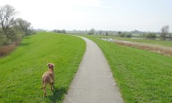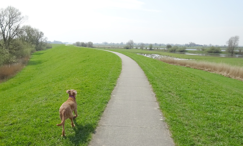 Het fietspad ligt helemaal alleen bovenop de dijk. Daar kom je dus helemaal niet op een andere manier. Het is echt prachtig en zo met het mooie weer al helemaal natuurlijk. Ik laat woef uit de kar en die heeft haar gekke half uurtje want ze rent als een idioot langs de dijk. Ik stap uiteindelijk maar op om haar bij te kunnen houden en besluit dat het na ruim een kilometer rennen (!) wel genoeg is voor haar met die warmte.