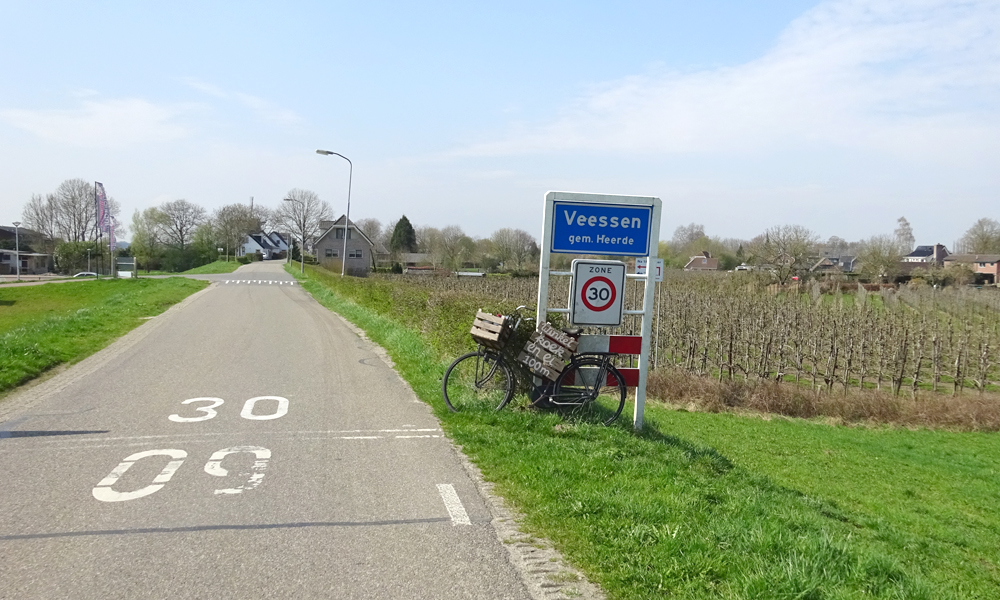 Aan de overkant van de IJssel moet ik eigenlijk meer landinwaarts gaan rijden. Maar ik vind de IJssel zo mooi dat ik besluit de route weer te verleggen en het fietspad langs het water te blijven rijden. Ik kom dan straks vanzelf weer op mijn eigen route uit dus dat moet geen probleem zijn. Inmiddels is het 13.20 als ik Veessen in rijd. Er staat dan 46 km op de teller. Op een gegeven moment rijd ik over een fietspad langs een brug met iets eronder. Ik heb geen idee wat dat voor kleppen zijn eigenlijk. De hoogspanningsmasten staan hier ook op palen. Zou dat iets te maken hebben met hoog water van de IJsel dan? Ik heb geen idee. Het is in ieder geval een prima fietspad.