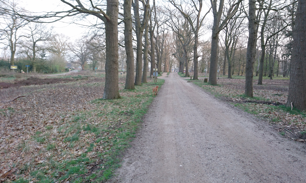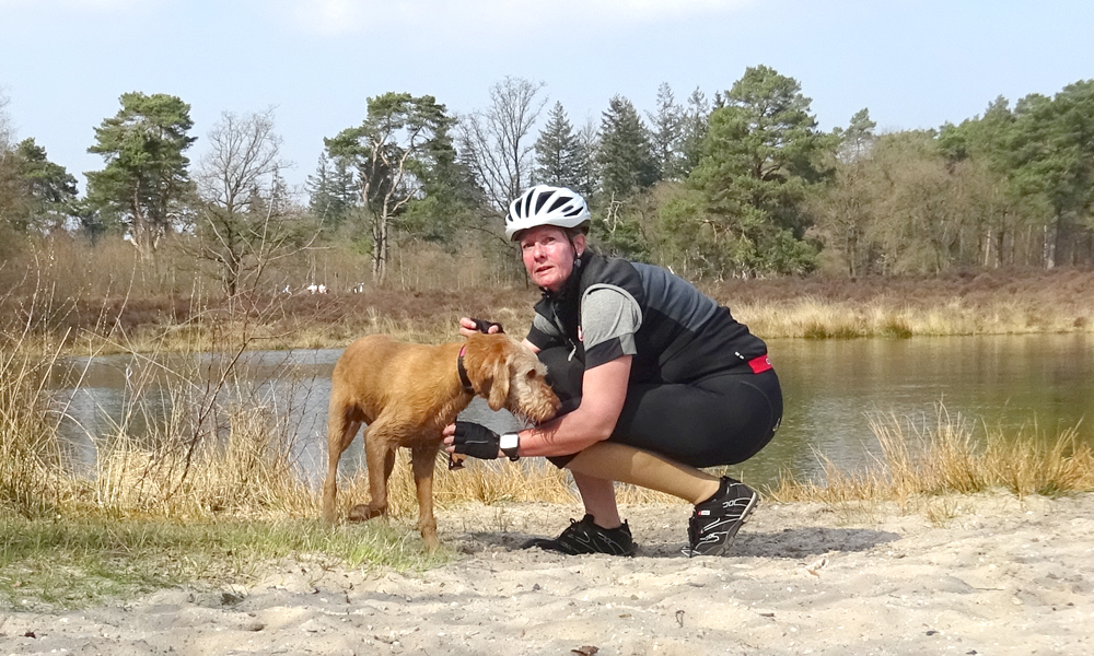 Ik moet het eerste stuk dus even goed op de kaart kijken waar ik nu heen moet om zo snel mogelijk weer op de route te komen. Nu mis ik wel een beetje de doorzichtige hoes op de stuurtas. Voorheen zat de telefoon in het frametasje met de doorzichtige bovenkant. Nu ligt de telefoon wiebelig bovenop en moet ik de deksel van de stuurtas open doen. Toch nog eens nadenken of ik de losse hoes wil hebben omdat we onderweg regelmatig op de kaart van de telefoon kijken waar ik heen moet. Maar ik kom er wel, hoes of niet. Ik besluit een andere route te nemen die me naar mijn getekende route zal leiden. Even nog een stuk door het bos en pas daarna richting de route rijden. Dat blijkt een goede keuze want het is een heel mooi stukje. Sallandse Heuvelrug prijkt er op een bord langs het fietspad. Nou ik ben benieuwd naar de heuvels maar zo aan de zijkant zal het nog wel meevallen want ik rijd natuurlijk helemaal aan de buitenkant van het gebied. Woefje mag er ook ergens weer lekker uit en waar het stijgt, laat ik haar ook gewoon even lekker lopen. Zij vindt het allemaal reuze leuk en het is heerlijk dat ze hier eruit kan en veilig kan lopen. Uiteindelijk rijden we het bos weer uit en rijden we door een gebied met veel veeteelt. Ik rijd door Marienheem en de eerste 15 km zitten er alweer op. Inmiddels is het 10.30 geworden.