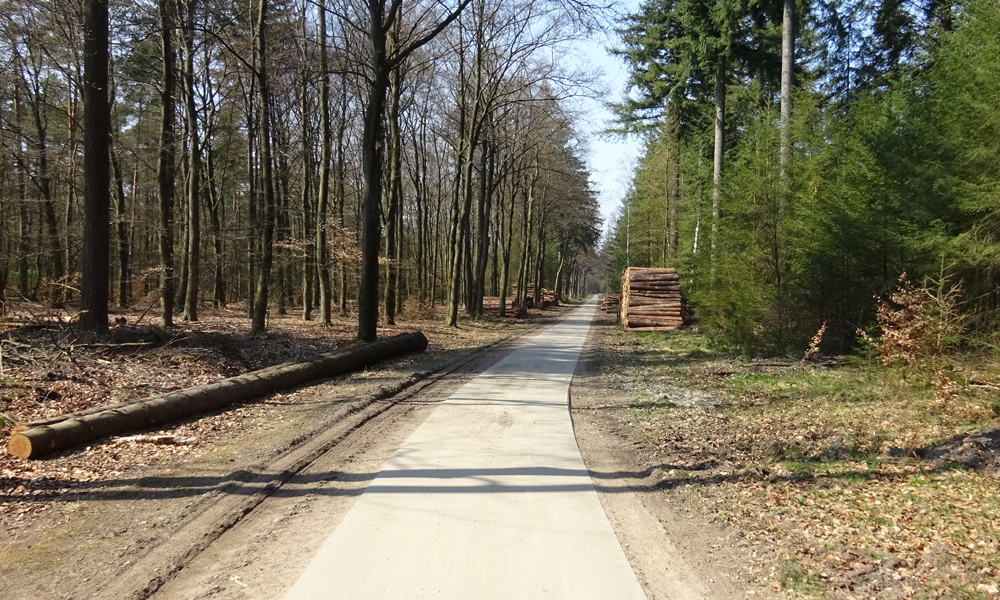 Ik fiets over het fietspad nu terug richting huis over een bekende route. Eerst naar de Elspeterweg nu. Het pad door het bos is langer dan ik me herinner van eerdere tochten. Omdat ik een pad parallel aan de getekende route neem, blijft de Teasi roepen dat ik terug moet en dat is best irritant dat gepiep. Voor auto’s is dit pas eenrichting verkeer maar met de fiets mag ik hier echt rijden. Blijkbaar staat dat niet goed in de kaart van de navigatie. Maar uiteindelijk steek ik de Elspeterweg over en rij het laatste stukje naar huis. Om precies 16 uur ben ik weer bij de afslag naar de Brandsweg waar ik gisterenochtend ook reed en rechtsaf sloeg. Toen moest mijn avontuur nog beginnen. Ik vind dat altijd weer apart. Het is allemaal maar heel kort maar heel intensief en leuk. Dat moeten we dus vaker doen.