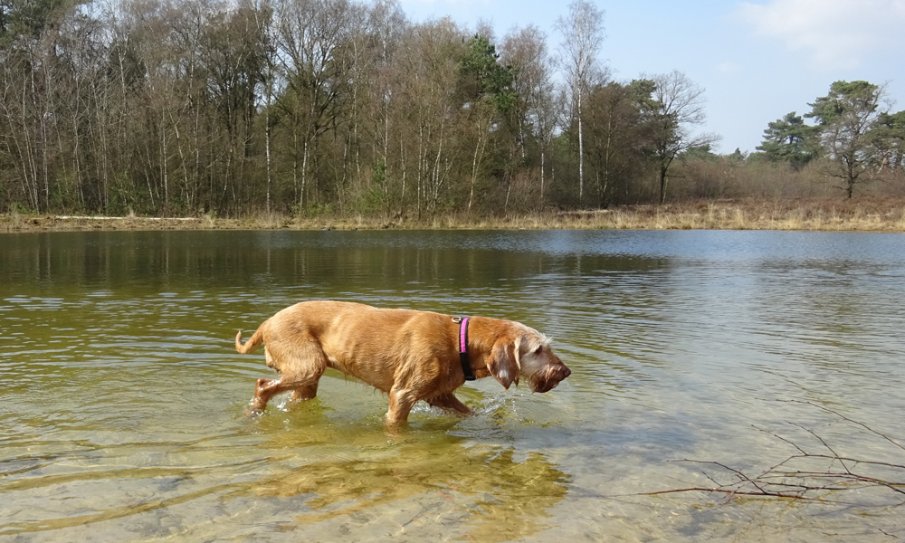 Rond 15.30 komen we bij de Waschkolk. Ik duw mijn fiets door het zand zodat we het water kunnen bereiken. Woefje is helemaal blij en gaat lekker badderen. Er staat inmiddels 75 km op de teller. We zijn er dus bijna want ik schat dat het vanaf hier nog maar 10 km naar huis is. Dan ben ik dus veel eerder thuis dan gepland maar dat is prima.