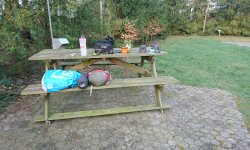 Om 7.30 ga ik er dan toch maar eens uit om een plas te doen en me aan te kleden. In de tent droeg ik mijn ondergoed en een onderhemd. Verder was niets nodig en in de tent wurm ik me in mijn buitenbroek, BH en trui. Woefje blijft nog even in de tent terwijl ik naar het douche gebouw ga. Straks gaan we wandelen natuurlijk. Het loopt langzaam tegen 8.00 uur als we weer terug zijn bij de tent. Het is droog en eigenlijk best goed weer zo te zien. Eerst straks even ontbijten en dan de boel weer inpakken. Ik ben benieuwd hoe lang ik nodig heb om alles klaar te krijgen maar ik ben ook heerlijk sloom. De vogelaars zijn al op pad dus dat is ook rustig.