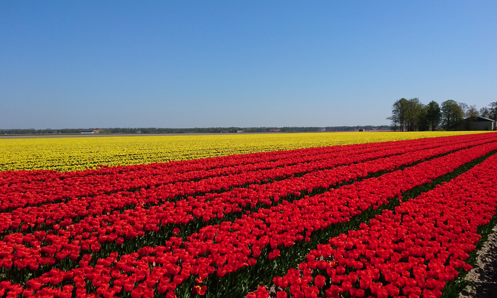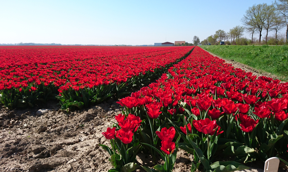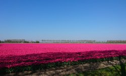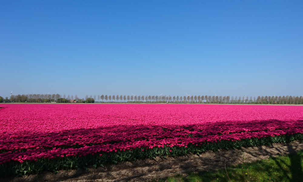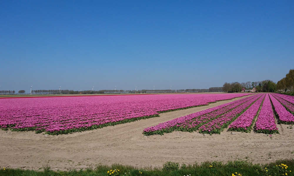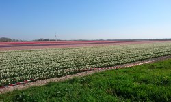 De route gaat eerst zuidwaarts richting Nagele en dan oostwaarts weer naar Marknesse waar op 25 km de controle zal zijn. Er staat een Oostenwind dus het begin van de route is wind tegen. Eigenlijk gaat het best voorspoedig ook al rijdt er werkelijk niemand waar ik eventueel mee op kan fietsen. Niet gezellig maar ik vind het wel best zo. Als ik een foto wil maken van de bollenvelden merk ik dat mijn camera niet wil zoomen. Bij de volgende foto die ik wil maken merk ik dat de camera in zijn geheel niet werkt. Beetje jammer dus want die is kapot. Dan maar met de telefoon. Elke keer als ik een foto wil maken moet ik dus even afstappen maar dat is niet erg want de bollen zijn mooi genoeg!