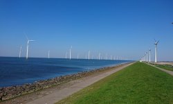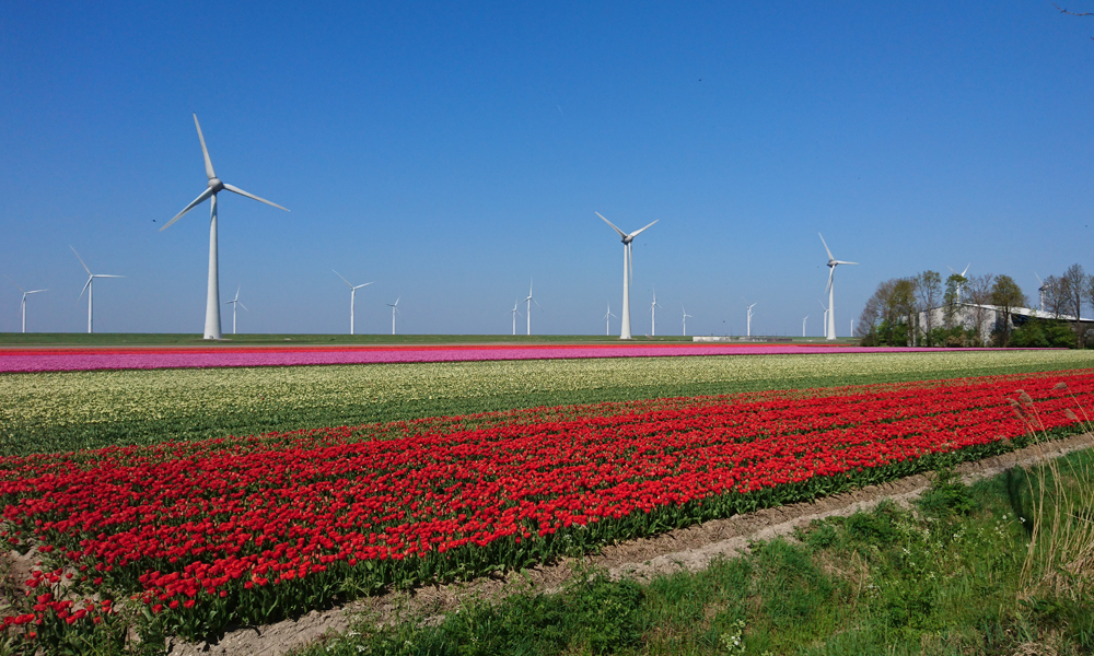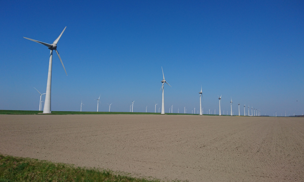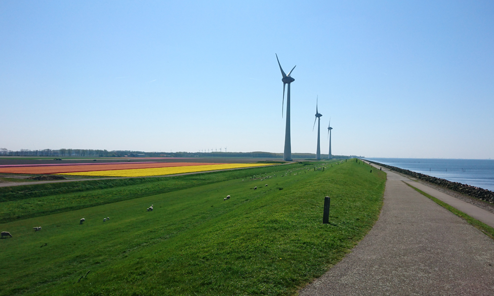 Vanaf daar gaat het ineens hard. Ik rijd ineens door een ander landschap. Nog meer open en met meer windmolens. Ver weg zie ik de dijk al ergens opdoemen. Maar het is wel afwisselend en met het mooie weer ziet het er allemaal wel aardig uit.