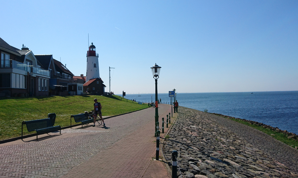 Het stukje over dijk richting Urk is eigenlijk prachtig. De lammetjes zijn leuk, de bollenvelden die ik nog net zie zijn mooi. Het laatste stuk is ook mooi met de zon op het water rechts van me. Er is geen lastige wind dus het is alleen maar genieten en fietsen. In de verte zie ik de vuurtoren van Urk. Ik kom dus vanaf de Noordzijde aan en dat is leuk.