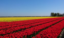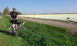 In dit deel rond Bant en Creil zijn duidelijk veel meer bollenvelden en later zal ik op de site van het bollenfestival zien dat de route vooral vanaf creil loopt en dan meer noordwaarts. Daar liggen blijkbaar de meeste bollenvelden. Misschien iets om nog een keer te doen op de fiets (55 km) of met de auto (99 km). Ik vraag een Duits echtpaar om een foto van mij te maken met de velden.