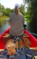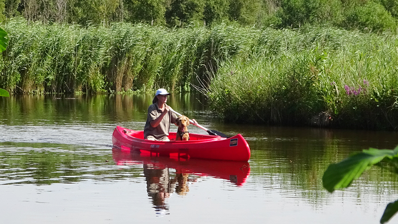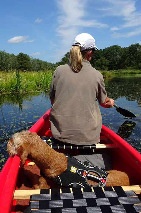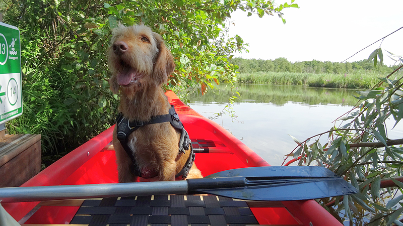 Vandaag weer op stap met de kano. Woef gaat ook mee voor de eerste keer. Het is erg mooi weer maar we hebben niet erg veel tijd aangezien de kano verhuurder om 5 uur al dicht gaat. We varen tot het steigertje op knooppunt 13 van de kanoroute en gaan dan weer terug. We zien onderweg een piepjong fuutje dat net uit het ei is. Er liggen nog drie andere eitjes in het nest. Het beestje is nog niet echt goed in kijken en zwemmen maar het is schattig om te zien. Op onderstaande video is op 2′ het beestje te zien en te horen.