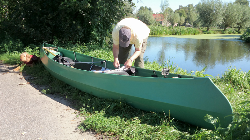 Het opbouwen gaat vandaag in record tempo. In 21 minuten zit de boot in elkaar. Daarna hebben we wel tijd nodig om alles weer in te laden en vast te hangen. Maar dat is ook wel onderdeel van de dag eigenlijk en inmiddels hebben we al aardig een routine opgebouwd wie wat doet. Woef ligt ondertussen rustig te slapen in de schaduw en wacht op wat komen gaat.