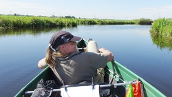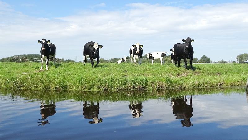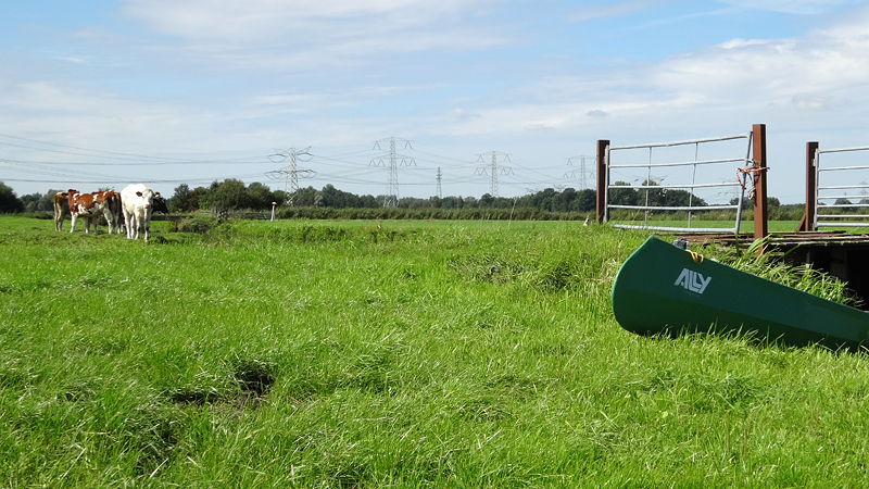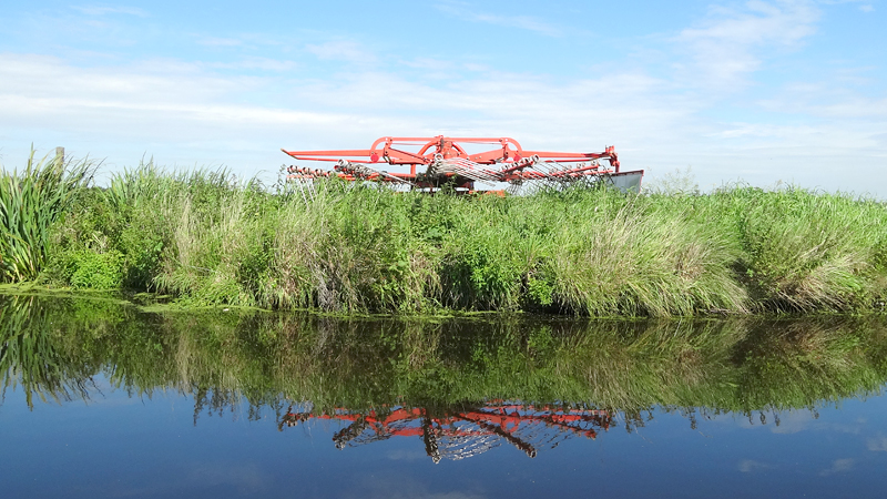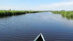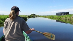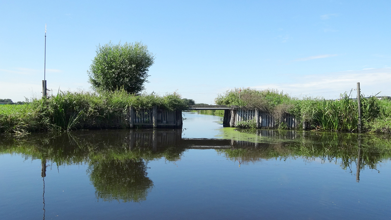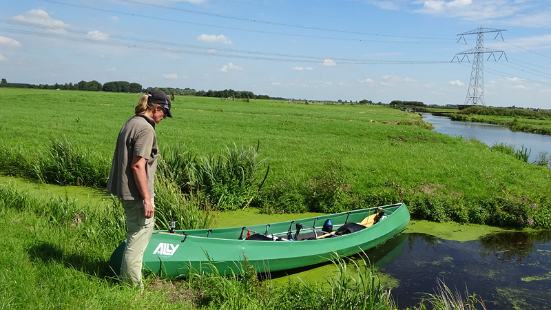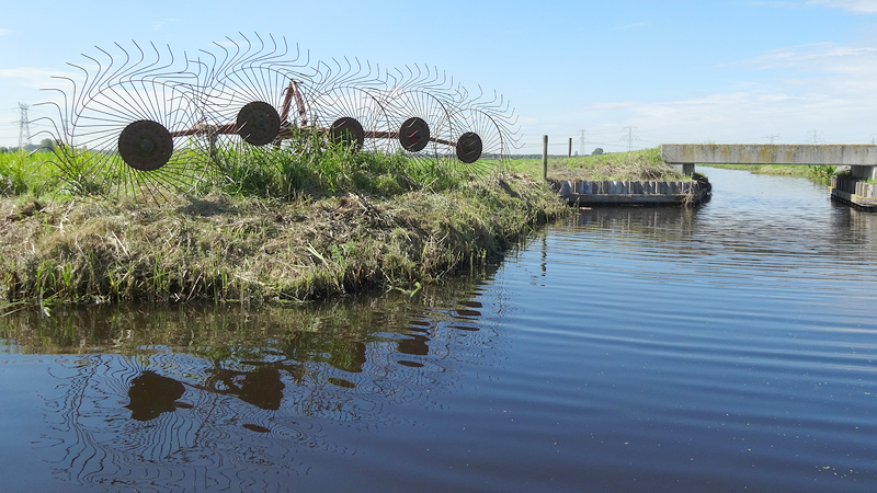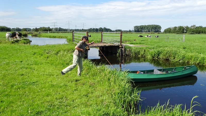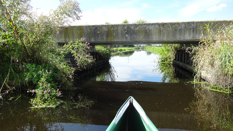 Het water is spiegelglad en het is vrij warm. De route tussen de weilanden is prachtig. Het is heel bijzonder om op die hoogte over de weilanden te kijken en er is van alles te zien. Schapen, koeien, zilverreigers en zelfs een purperreiger die opvliegt. Ook de machinerie van de boeren is leuk om naar te kijken. Normaal kan je hier dus op geen enkele manier komen en misschien is dat ook wel wat het zo aantrekkelijk maakt. Noch per fiets, noch wandelend kan je hier komen! Er zijn enorm veel bruggetjes die van het ene weiland naar het andere lopen. De meeste zijn heel er laag. S. ligt dan achterover, ik ga snel op de grond zitten en met wat intrekken van mijn hoofd kan ik ons dan net gemakkelijk onder de bruggetjes doortrekken.