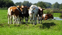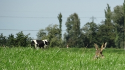 We genieten er eigenlijk wel van. Meer dan van de route van gisteren. Er is hier van alles te zien, het is stil en rustgevend. Ergens in een weiland zit een haas naar ons te loeren. Op de achtergrond de weg die je hier niet hoort en een koe. Helaas geen al te beste foto maar wel een leuke impressie.