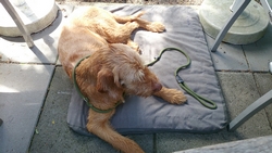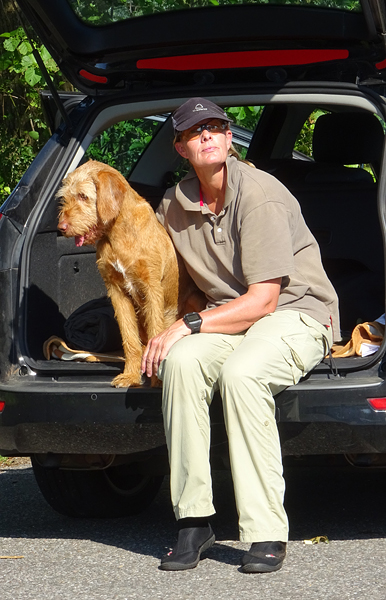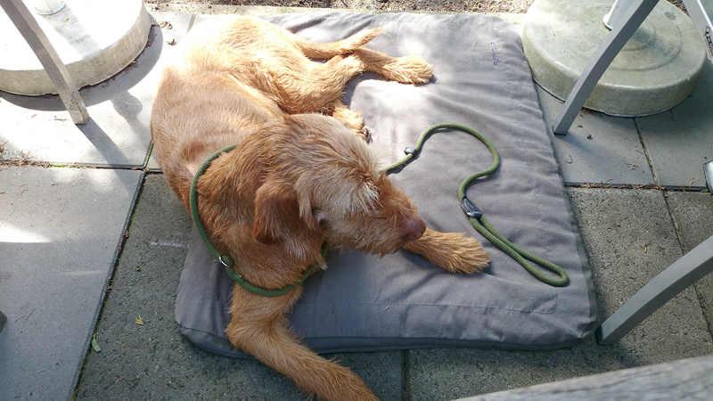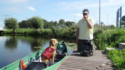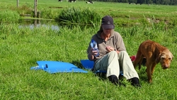 Halverwege leggen we even aan op een weiland (waar je normaal dus ook niet komt) en luieren wat in de zon en geven woef te drinken. Zij stapt in en uit alsof ze nooit anders doet. Heel bijzonder.