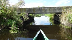 Maar goed, al varend en rommelend met de cam komen we ineens al snel bij eerste obstakel van de dag. Onder de brug ligt iets en we zien niet goed wat het is en stoppen de kano. Het is een houten balk maar er zitten zelfs spijkers op die omhoog steken. Eigenaardig. We kijken goed en we kunnen er links wel voorzichtig overheen en dat gaat goed. Het is lastig want het is een hele lage brug (een duiker) en S. ligt al achterover om eronderdoor te kunnen dus ik zit een beetje te pielen met mijn handen en trek ons voort onder de brug door. Maar we zijn er!