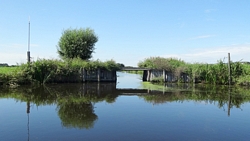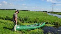 Dan zijn we alweer aan het einde gekomen van de route tussen de weilanden en slaan we linksaf richting Breeka waar we zullen lunchen. We weten al dat het bruggetje is ingestort en dat we weer moeten overdragen. Het is alleen even speuren naar een geschikte plek om de kano aan land te krijgen en ook weer in het water te laten maar het lukt.