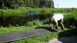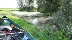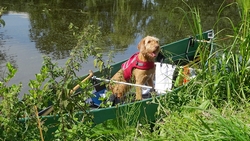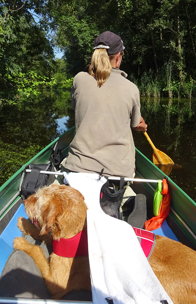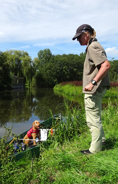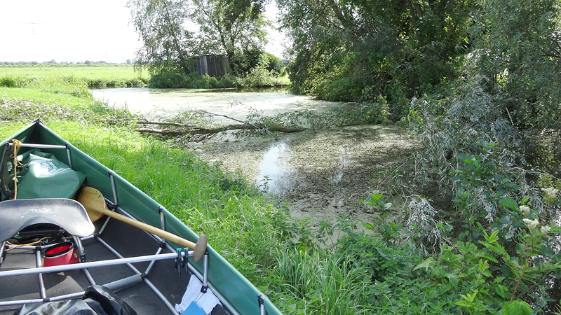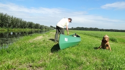 Als we het niet meer verwachten krijgen we nog een obstakel: er is een boom over het water gevallen en we kunnen er niet langs. Er is echter maar weinig wal en dat staat vol met brandnetels, is zacht en schuin zodat de afstand tussen kano en oever vrij groot is. Lastig maar we kijken rustig waar we eruit kunnen. Dat gaat goed en we slepen de kano langs de boot. Dan ergens een plekje zoeken waar we er weer inkunnen. We besluiten woef op de oever te laten instappen en haar daarna met kano en al het water in te duwen. Dat gaat – tot onze verrassing – prima en ze laat zich gewoon rustig afduwen. Daar zit ze dan. Nu wij nog!