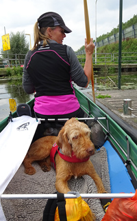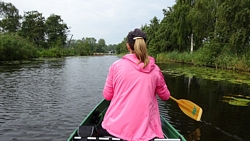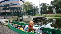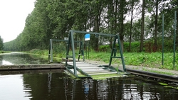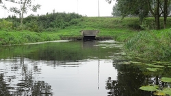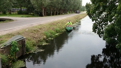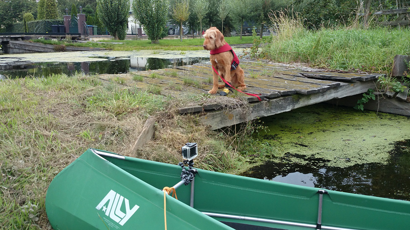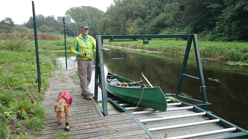 Er is best wat te zien maar er zijn een aantal bruggetjes die veel te laag zijn om onderdoor te varen. De weg langs het water is smal en beredruk. Het overdragen hier is niet eens zo makkelijk want we hebben ook de hond waar we op moeten letten. Gelukkig kunnen we haar bij het overdraagpunt even op een gammel bruggetje laten zitten (van de weg af) zodat wij de kano kunnen wegbrengen en in het water kunnen laten. Ze zakt er bijna doorheen overigens en wij hebben ook moeite om de boot uit te komen doordat de oever hoog en brokkelig is.