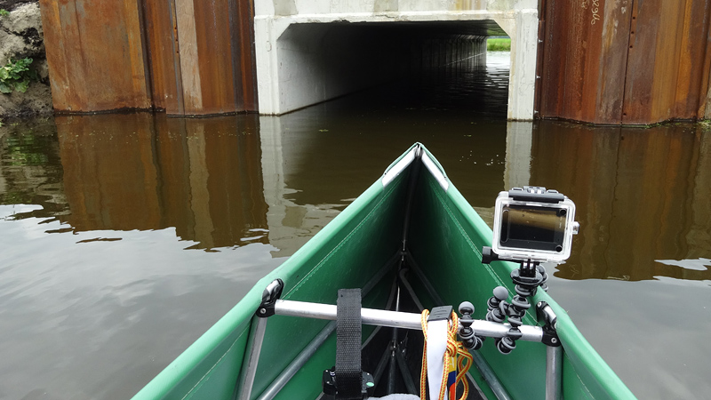 Dan stuiten we op werkzaamheden en de vaart buigt naar rechts. Ik kijk op de kaart want ik herinner me niet dat we naar rechts moeten. We gaan zelfs gewoon de verkeerde kant op maar we hebben geen keuze. Er is geen vaart de andere kant op en van overdragen werd niets gezegd. We varen een stukje door omdat het erop lijkt dat er een doorgang onder de weg is en dat blijkt te kloppen. Een akelig lage doorgang waar ik weer via mijn handen de boot onderdoor trek. Het gaat allemaal wel maar het is toch wel weer apart zo. Nergens staat het in de beschrijving maar op de stickers onder de brug staat 12-2014 dus dit ligt er blijkbaar nog niet zo lang. Op de video staat de doorgang toevallig gefilmd.