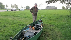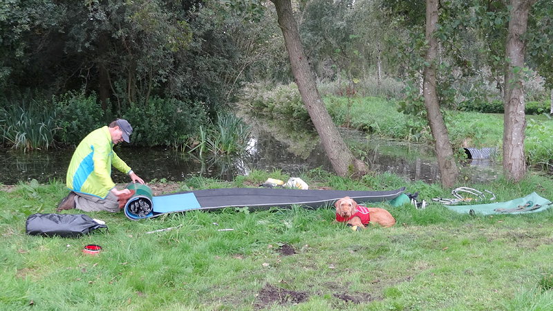 Laatste weekend voor vertrek naar de UK en we willen toch nog even op pad. Het weer is dubieus, rond 13 uur wordt regen verwacht, maar we besluiten toch maar op weg te gaan want het ziet er goed uit. Ik heb vanmorgen niet gelopen, ik was ontzettend lui en dacht dat ik in de avond nog wel even zou gaan (nee dus). Maar om 11.30 starten we met opbouwen en dat doen we aardig rap zonder gedoe en 45 minuten later liggen we al op het water. De meeste tijd gaat nog in het verdelen van de spulletjes zitten. Opbouwen doen we nu met onze ogen dicht hoewel de schuine waterkant en het hobbelige gras niet echt meewerkte.