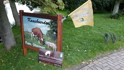 Dan zien we ineens een uithangbord van een kaasboerderij en we besluiten wat kaas te gaan kopen. Best een grap maar ook niet zo makkelijk als we denken. Er staan twee blaffende honden dus we besluiten maar niet aan de tuinkant aan te leggen (makkelijker) maar aan de wegkant zodat ik via de normale weg het erf op kan lopen. Misschien vinden ze dat wel OK.