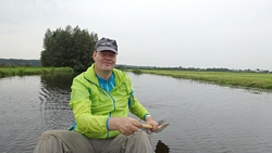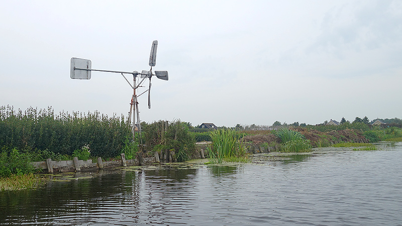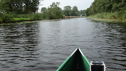We lopen aan het einde van deze vaart even vast omdat de route een rondje aangeeft terwijl die er helemaal niet blijkt te zijn. We varen dus weer terug en kunnen nog net keren met onze 5 mtr boot zonder vast te lopen in de oever en in het lage water. Daarna kunnen we doorvaren en komen we op een uiterst saai stukje tussen weilanden waar gewoon helemaal niets te zien is.