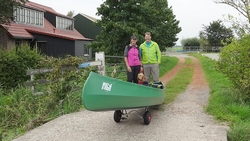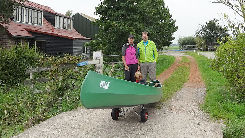 Dan stuiten we weer op idioot lage bruggetjes en moeten we eruit. Aan de wegkant is het onmogelijk om eruit te komen dus besluiten we toch aan de kant van een huis aan te leggen en over het terrein van de bewoner te lopen. Dat moet net kunnen, de boot kan wel door het hek heen denken we. Als we aan het klooien zijn om aan te leggen komt net de eigenaar thuis die aan komt lopen. Ik zet me al schrap voor een ‘wat doet u hier’ maar hij helpt ons zelfs om de boot uit het water te krijgen en door het hek te trekken en op de kar te leggen. Hij is wel geinteresseerd in de boot en de kar en we staan even te kletsen en hij maakt twee foto’s van ons.
