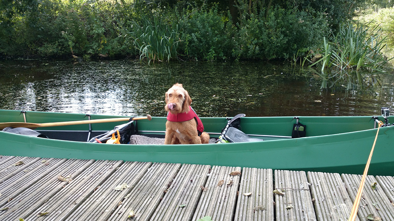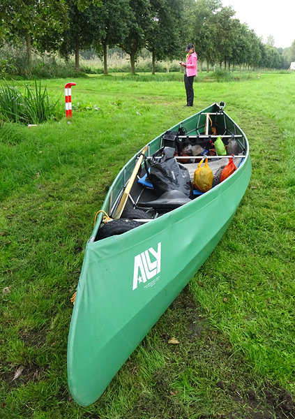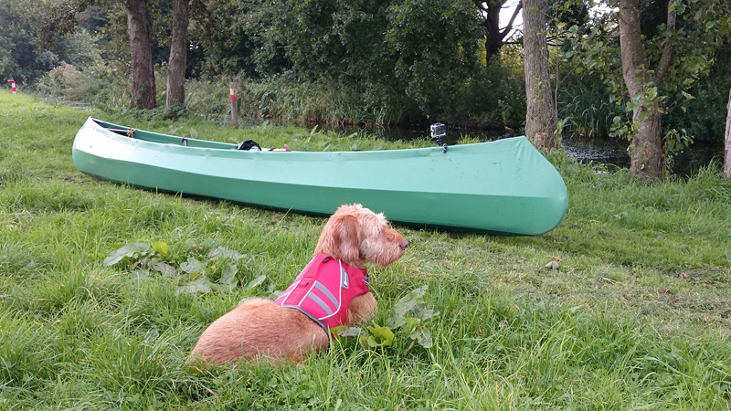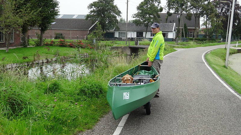 Hij waarschuwt ons voor alle lage bruggetjes die nog gaan komen en we lopen dus een stukje met de kar over de weg. We doen waf op de kar zodat we niet op haar hoeven letten en dat vindt ze allemaal prima. Het enige probleem is dat we nergens meer normaal in het water kunnen komen. De oevers zijn overal veel te hoog. We lopen dus best een stukje met de kano.