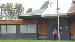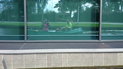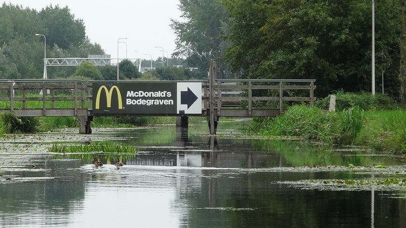 We komen bij McDonalds Bodegraven en omdat er niemand bij de McDrive staat, vinden we het wel een grap om een frietje te halen. Maar niemand wil ons helpen want voetgangers worden niet geholpen aan het raampje. Dan niet en ik stap weer in de kano en we gaan weer op pad. Idioterie.