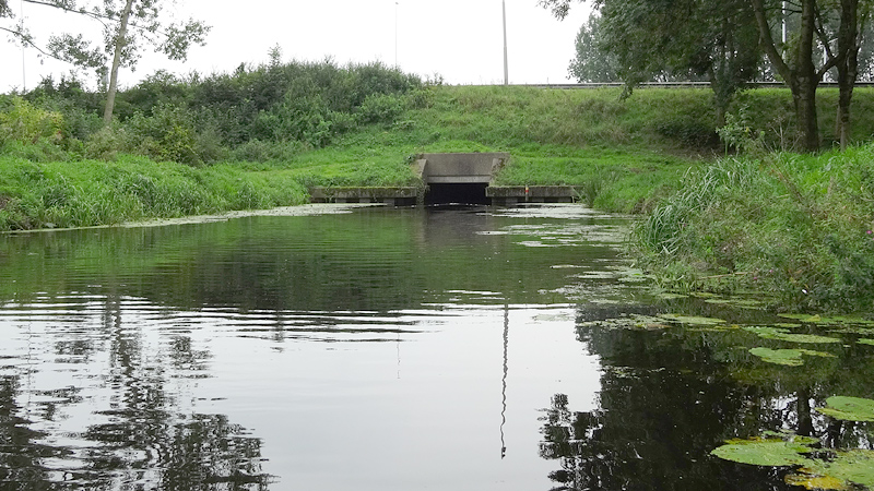 We varen een stukje verder en komen bij een vrij lage onderdoorgang bij de A12. Daar moeten we dus ook weer doorheen en het is weer een kwestie van op de bodem van de boot gaan zitten en met de handen voortduwen. Het is een heel eind omdat je al die snelweg banen moet overbruggen. Maar het gaat natuurlijk best en we komen aan de andere kant van de snelweg uit.