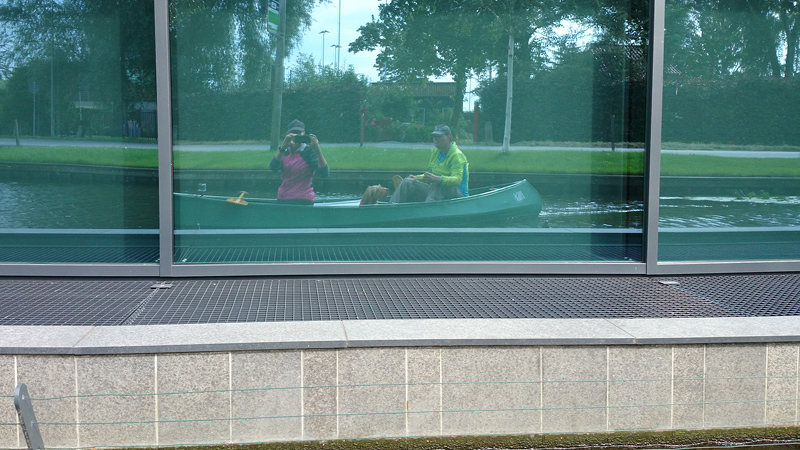 De weg is niet eens helemaal recht toe recht aan en ik moet toch wel op de kaart loeren of we wel goed gaan. Het is van alles wat. We starten in een rustig stukje maar komen nu ineens tussen de kantoorgebouwen uit met een drukke weg waar het verkeer erg hoorbaar is. We varen langs een kantoor en zien onszelf in de ruit weerspiegeld.