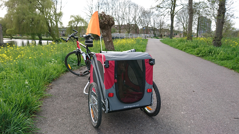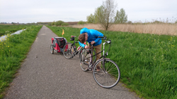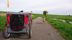Vandaag gaat S. mee op de fiets. Vanmorgen hebben we al 16 km gelopen en liep wafje ook lekker mee met ons. Dat ging gelukkig allemaal prima. S. fietst vandaag op de Batavus en dat valt hem duidelijk niet mee. We besluiten tijdens de eerste wandel lap het zadel eens wat hoger te zetten en wisselen meteen van fiets. Ik ga op de Batavus rijden en S. fietst met de ATB en de doggyride. Zo zonder de doggyride fietst de Batavus best lekker maar het kost me wel even moeite om de dijk op te fietsen. Dat gaat met de Fuji echt veel gemakkelijker, met of zonder doggyride!