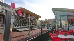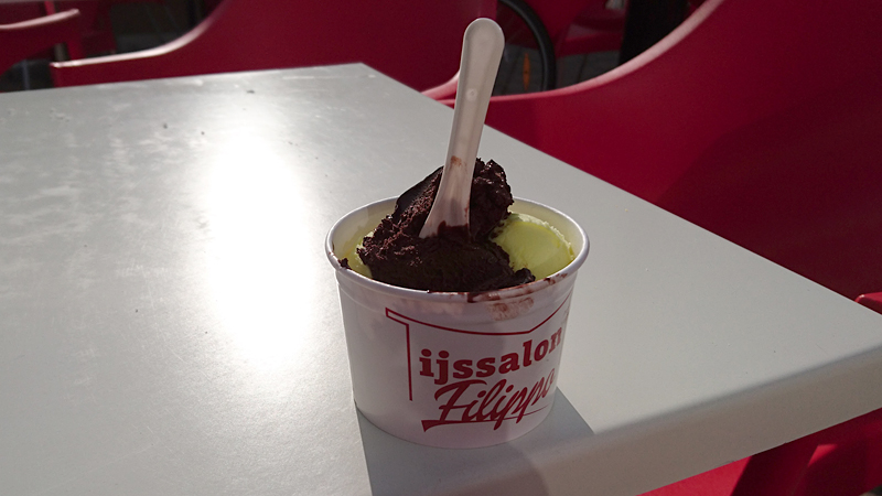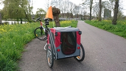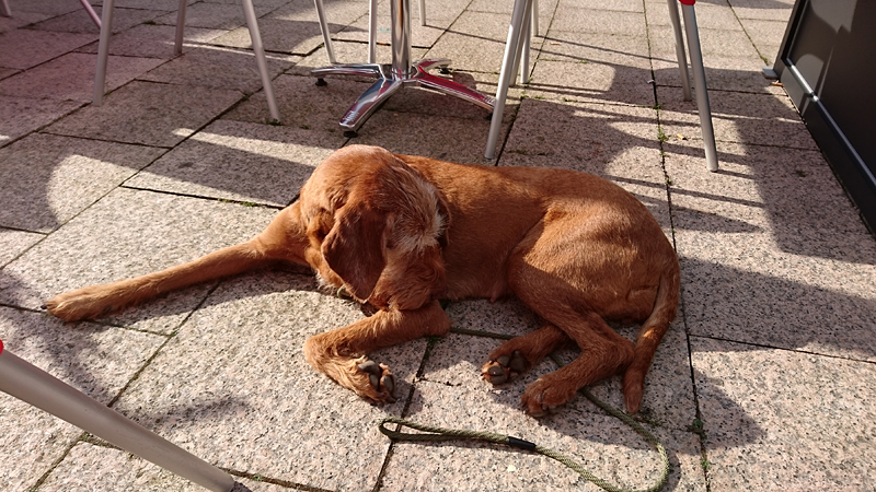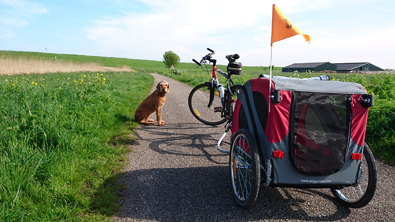 Omdat het bijna haar voedertijd is, geef ik haar onderweg wat eten en doe haar daarna terug in de doggyride. Dat is wel heel makkelijk zo onderweg. Uiteindelijk rij ik toch nog even naar de ijssalon voor een klein ijsje en een warm kopje thee. Inmiddels is de kermis helaas begonnen en is het druk maar op het terras zit het wel even lekker. Woefje ligt heerlijk in het zonnetje.