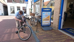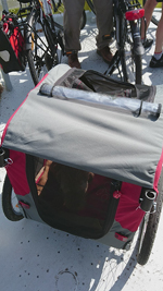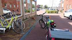 Al snel staan we aan de overkant en daar plettert ineens de nieuwe Tubus achterdrager van de fiets met mijn tasje. Gelukkig staan we net naast een fietsenwinkel want nou net dat ene moersleuteltje hebben we niet bij ons. Een goede les want voor vertrek moeten we echt zeker weten dat we alle maten en soorten spulletjes bij ons hebben voor het geval dat er iets los of kapot gaat. Al snel staat S. zwetend en scheldend de boel weer in elkaar te zetten. Maar waarschijnlijk gebeurde dit omdat hij nou net deze boutjes niet had vast gezet. Nog een geluk dat het op de vorige route dus allemaal is blijven zitten! Ik haal woef maar even uit de warme kar en ze gaat er lekker bij liggen. Dat zal wel even duren….