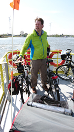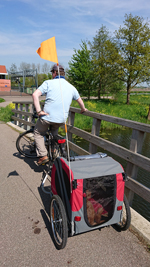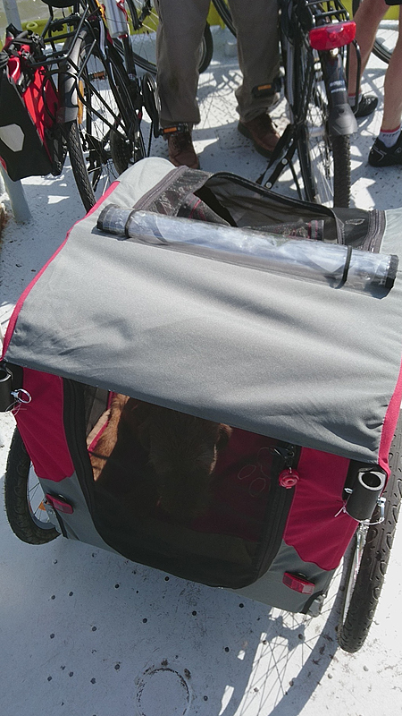 Vanmorgen hebben we 19 km gelopen en nu gaan we op pad voor een rondje op de fiets. We maken een route om de Teasi te testen onderweg en daarna gaan we op pad. Het is nog steeds stralend weer maar niet te warm om te fietsen. Deze keer trekt S. de kar op zijn nieuwe fiets. Daar zit inmiddels ook en koppelstukje op voor de doggyride zodat we kunnen afwisselen. Dat is ook het plan, dat we ieder een stukje met de kar zullen rijden. We zijn mooi op tijd voor het veertje naar de andere kant van de IJssel deze keer.