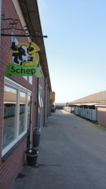 We nemen bijna dezelfde route als de vorige keer want het blijft mooi. Als we langs weilanden fietsen, zien we weer het bord van boerderij Schep waar ze ijs en kaas verkopen en we besluiten om te keren en een stukje kaas te gaan halen daar. We moeten toch even zoeken maar uiteindelijk komen we bij de boerderij en daar kies ik een mooi kaasje uit om mee te nemen naar Schotland volgende week voor de eigenaar van het huisje en een lekker stukje voor thuis. We nemen ook allebei 1 bolletje citroen ijs. Dat is lekker fris en ondertussen kijken we naar de kalfjes die naar buiten loeren.