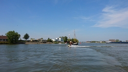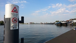 We rijden weer verder door weilanden en het is heerlijk rustig en vredig onderweg. Straks zullen we linksaf slaan en naar de kleine voetveer aan en niet weer richting Moordrecht. Deze route is zo ook wel lang genoeg denken we. We maken op de dijk even vaart om niet te hoeven wachten op het voetveertje en dat lukt. We zijn keurig op tijd en al snel komt het bootje er alweer aan.