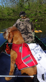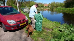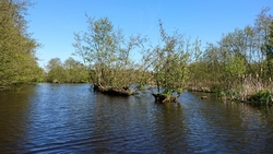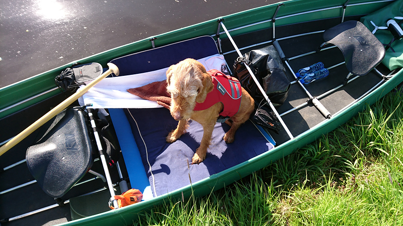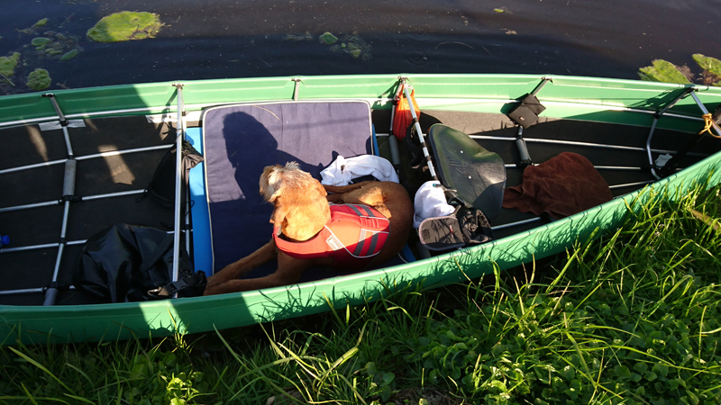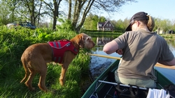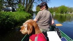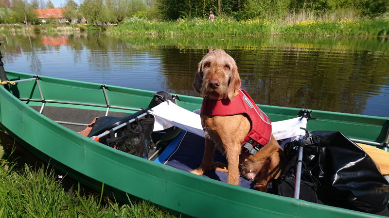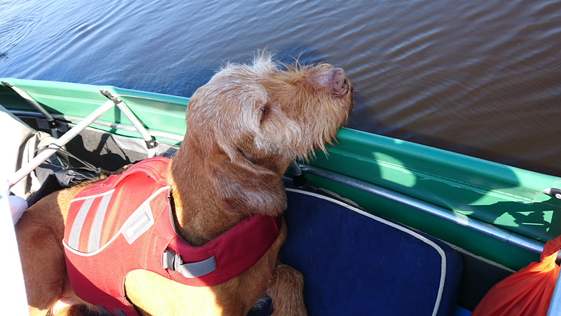 Na 45 minuten horen we ineens een ijsvogeltje en even later zien we het beestje vliegen met het zonnetje op zijn blauwe rug. Geweldig! We leggen de boot even naast een struik die in het water hangt en wachten even af. We hoorden dit ijsvogeltje immers ook al tijdens ons fietsrondje van de week en hopen dat hij zich nogmaals laat zien. Ondertussen voer ik woef haar middageten.
