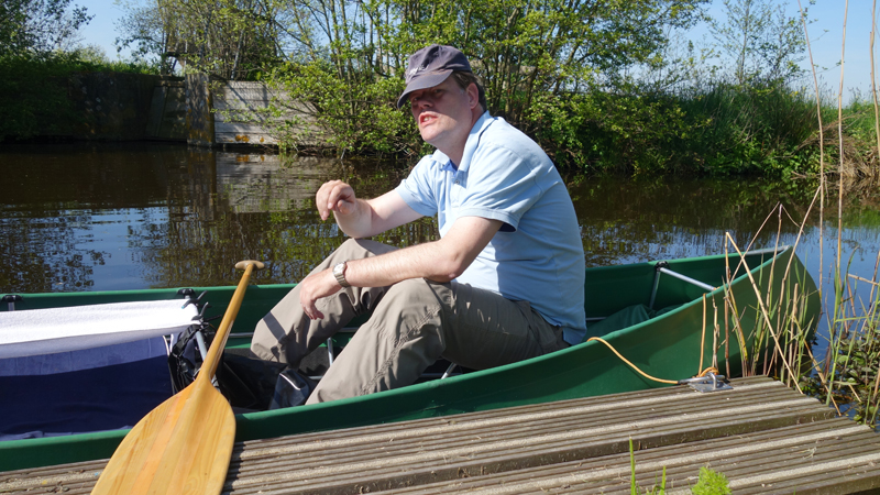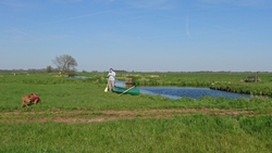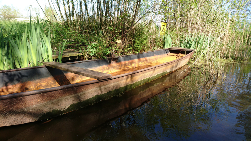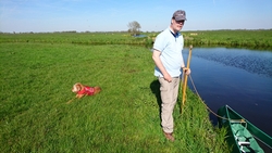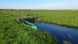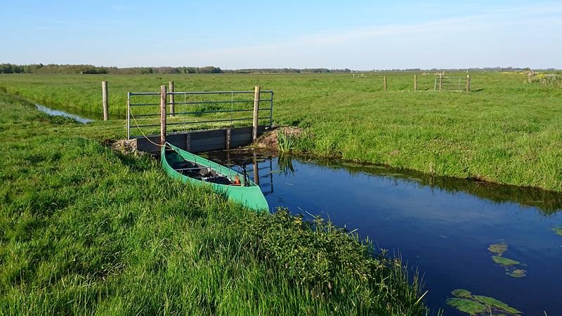 Aan het einde slaan we rechtsaf en varen tussen de weilanden door. Normaal kan je hier dus niet komen, noch met de fiets, noch wandelend. Er zijn geen paden alleen weilanden met water tussendoor. Dat maakt het zo leuk om te varen want zo zie je nog eens wat en je komt ook heel dicht bij dieren in de weide. We moeten bij 1 heel laag bruggetje even overdragen maar dat is geen probleem. S. wacht even bij de kano terwijl ik ga kijken waar we het beste er weer in kunnen vanaf het weiland.
