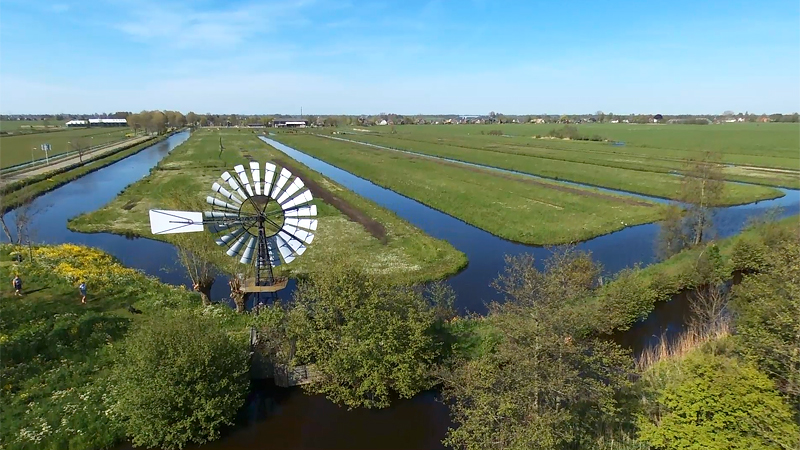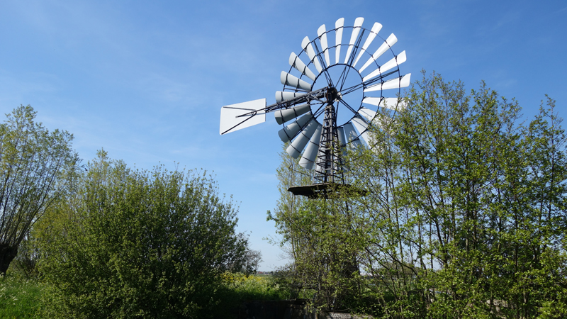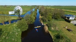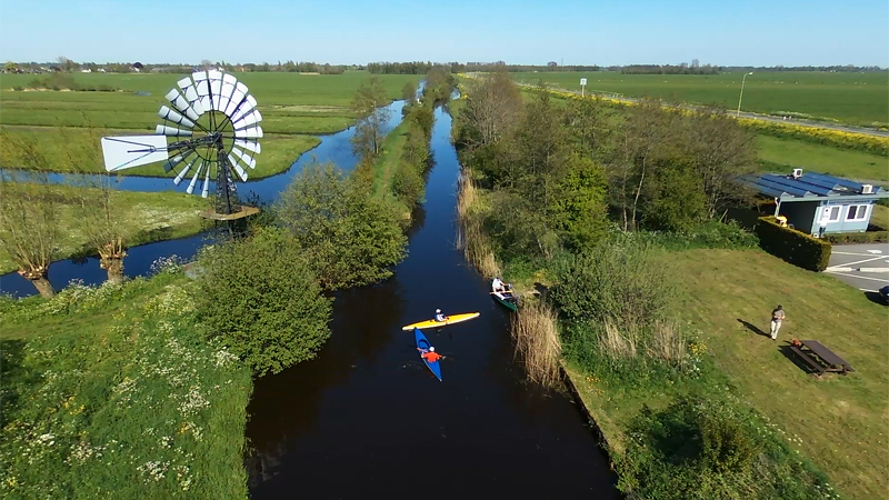 Daarna varen we door en leggen uiteindelijk even aan bij een steigertje waar een molen staat. Daar laat ik ook de drone weer even op. Grappig genoeg komen er 2 kajaks die S. verwijten maken dat hij alles blokkeert. Dat is niet zo, want we liggen keurig aan de steiger maar de twee mensen willen ook daar aanleggen omdat de auto daar staat. Niet erg vriendelijk maar goed. S. maakt plaats en de kajakkers stappen uit.