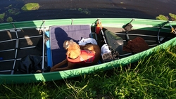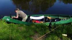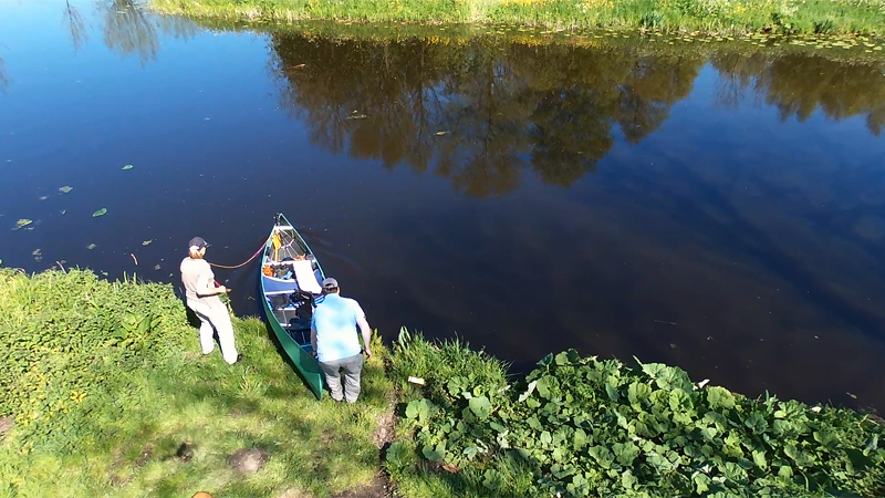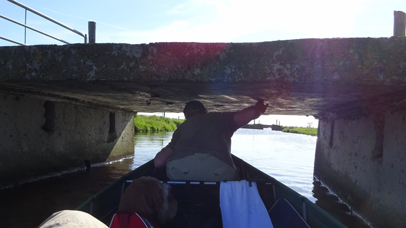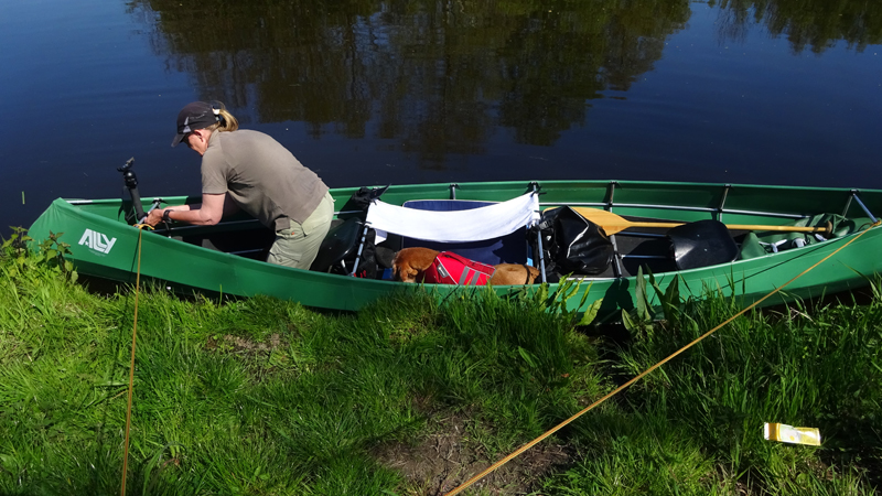Daarna varen we onder de weg door en moeten we een stukje door ondiep water varen. Ik herinner me de route van 11 augustus 2015 waar we ook maar moeizaam vooruit kwamen op dit stukje. We hadden toen haast omdat we de kano terug moesten brengen en dat deed ons toen besluiten om zelf iets aan te schaffen.