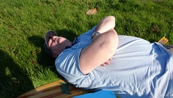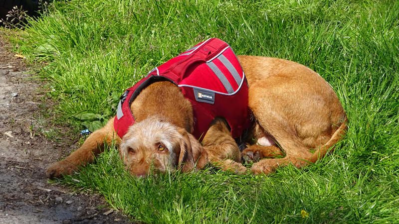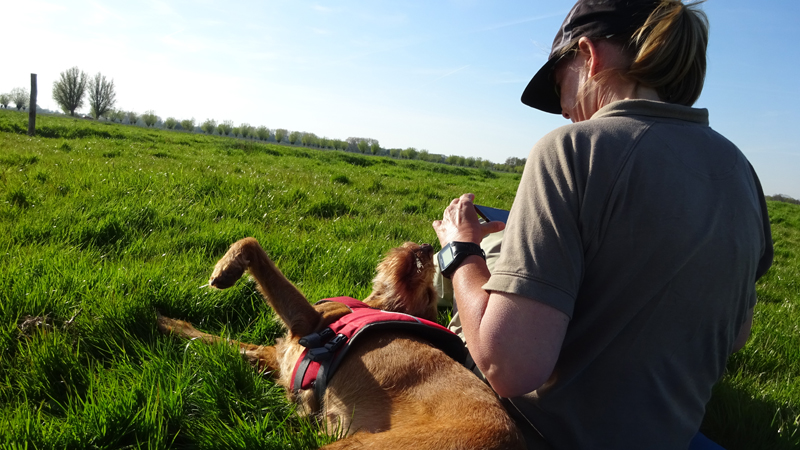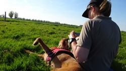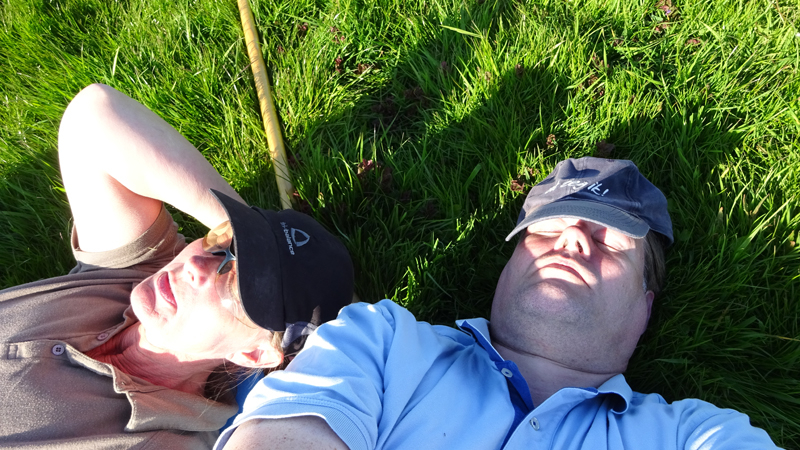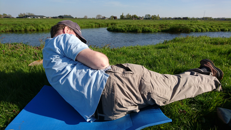 We besluiten vlak voordat we weer naar rechts zullen gaan richting parkeerplaats om even lekker in het zonnetje te gaan liggen. Heerlijk rustig zo in de wei natuurlijk!